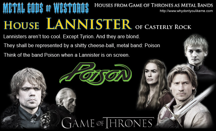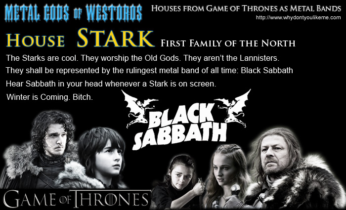 Yeah I got a Game of Thrones problem. Or a story of Ice and Fire Problem, whatever you want to call it. I seriously dorked out on this idea that if you were totally unfamiliar with the series then an easy way to identify the different houses would be to associate each with a different 90’s metal band.